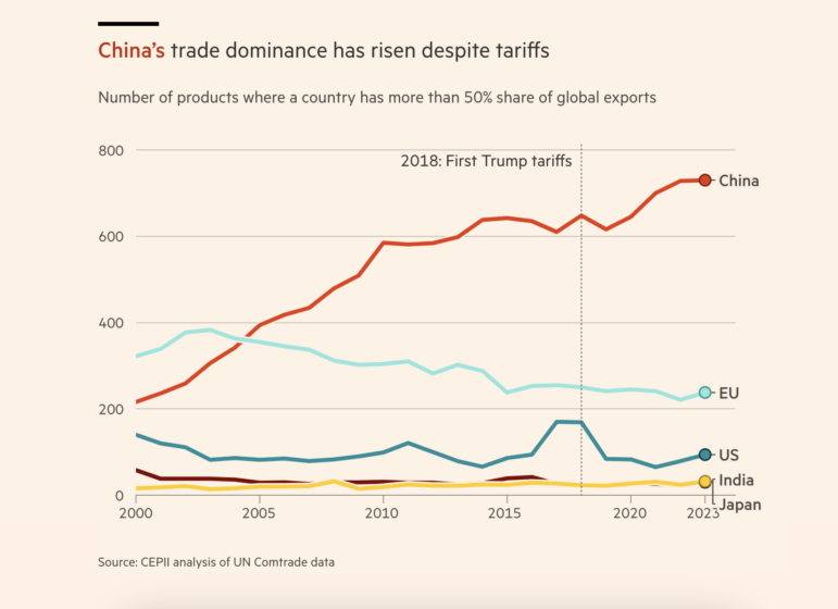 The Times article explains that Donald Trump’s tariffs did not reduce Chinese imports. Even with highly aggressive tariffs, the share of U.S. imports from China decreased by only 7 to 8 percentage points from 2018 to 2024, although industry estimates suggest that the actual fall in Chinese-origin goods entering U.S. supply chains is smaller (perhaps around 3 to 4 percentage points), due to relabelling and third-party routing.