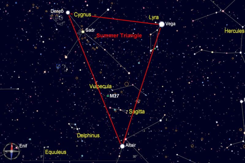 Summer Triangle, which consists of the three of the brightest stars in the sky–Vega, Deneb, and Altair. The Summer Triangle is high overhead throughout the summer, and it sinks lower in the west as fall progresses. For this star hop, start from brilliant blue-white Vega (magnitude 0), the brightest of the three stars of the Summer Triangle.