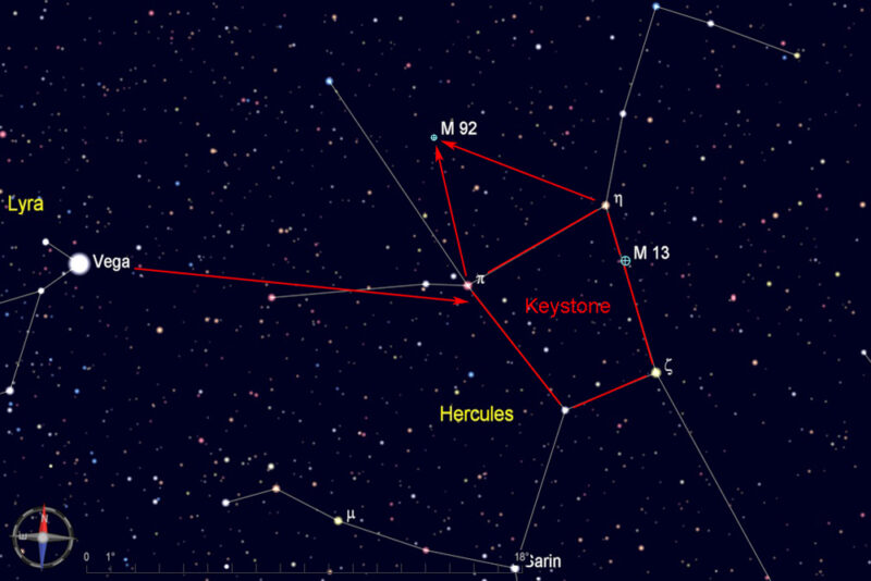 From Vega, look about 15 degrees west for the distinctive 4-sided figure in the centre of Hercules known as the keystone. On the north side of the keystone, imagine a triangle pointing to the north, with the tip of the triangle slightly shifted toward Vega (as shown in the chart below). This is the location of M92.