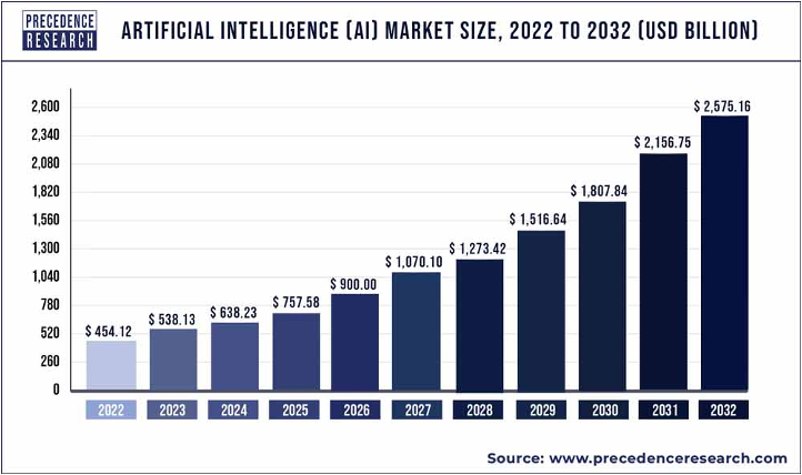 According to a report by Precedence Research, the global artificial intelligence market was valued at USD 454.12 billion in 2022 and is expected to hit around USD 2,575.16 billion by 2032, progressing with a compound annual growth rate (CAGR) of 19% from 2023 to 2032. The Asia Pacific is expected to be the fastest-growing artificial intelligence market during the forecast period, expanding at the highest CAGR of 20.3% from 2023 to 2032. The rising investments by various organisations towards adopting artificial intelligence are boosting the demand for artificial intelligence technology.[1]